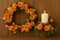 Klasyczny wianek świąteczny na żywych gałązkach – szyszki, anyż, pomarańcze i gwiazdki