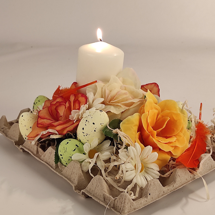 - świeca, 7 pisanek, 3 kwiaty palmy, 5 róż w odcieniach od kremu, przez żółty po pomarańczowe, pióra gęsi pomarańczowe